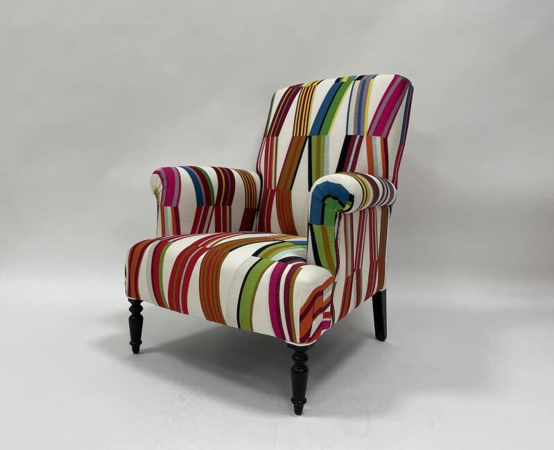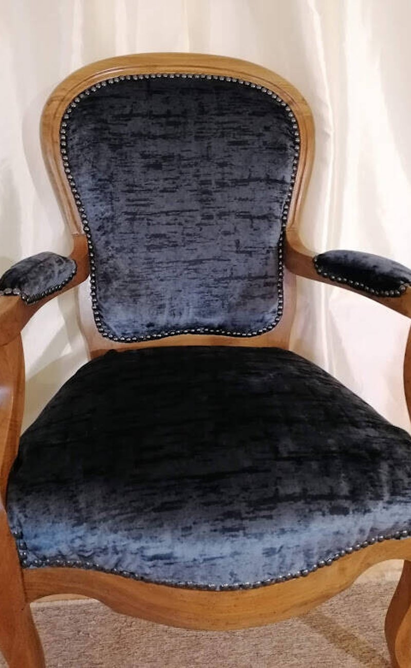 3. Réfection complète : - Réfection de l’ensemble du siège (assise, dossier, accoudoirs), garniture mousse, pose du nouveau tissu sur l’ensemble de la pièce.